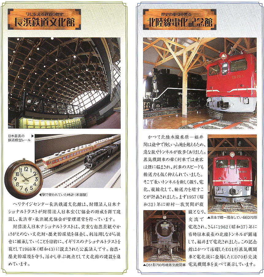 線に関する鉄道史料や鉄道模型が展示されている。北陸線電化記念館では鉄道車両2両が保存されている。