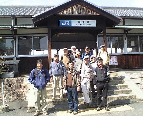 JR櫟本(いちのもと)駅前にて「世界へ発信!」記念撮影。今回から乾さんの先輩の山崎さんも参加して、今までの例会で最多の
