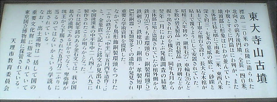 東大寺山古墳は、奈良県天理市に所在する、古墳時代前期中葉にあたる4世紀後半頃に築造された前方後円墳である。和爾下神社古