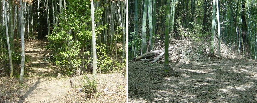 天理教教会敷地から細い道を一列で古墳のある竹林へ。