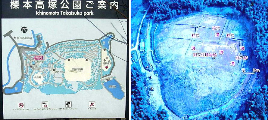 櫟本高塚公園の案内図。櫟本高塚遺跡発掘時の現場写真