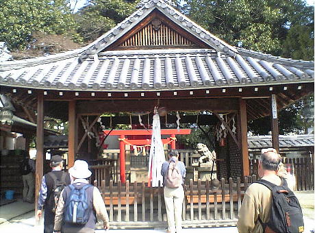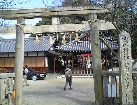 くと、不意に赤坂比古神社の前に出る。神社は櫟本町を西南に望む標高約90mの台地に鎮座する。石の鳥居をくぐると、正面に拝