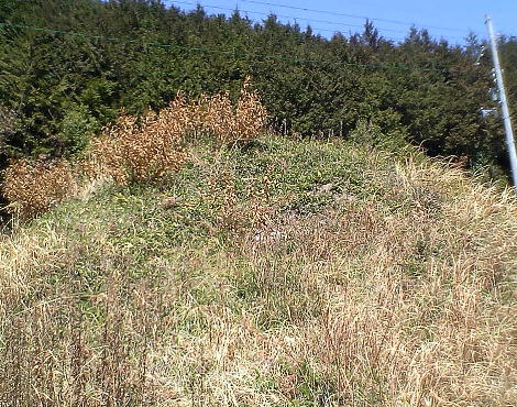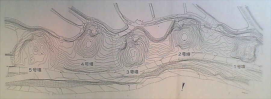 墳群。円墳3基、方墳2基が手前から1号墳−5号墳と繋がっている。山裾を掘削、盛土して作られている。1号墳、3号墳、5号