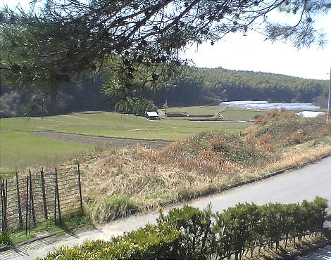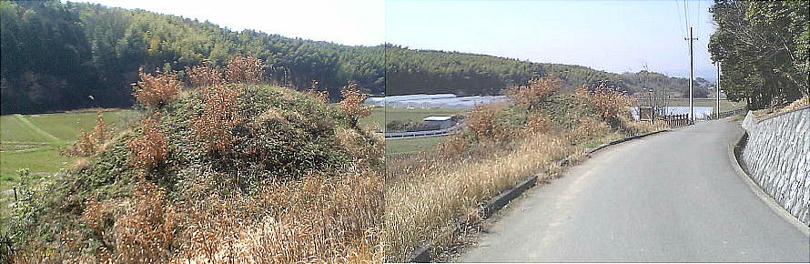 上左が4号墳と5号墳。上右は3号墳を道の下、田んぼの方から見たところ。下の写真も田んぼから見た2号墳、1号墳。
