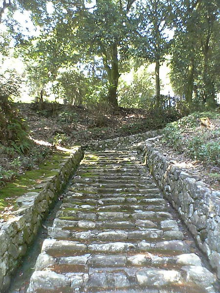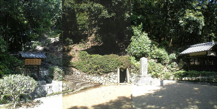 「円照寺宮墓」の石段と、この石段を登ったところから見た五つ塚古墳(3,4,5号墳)。