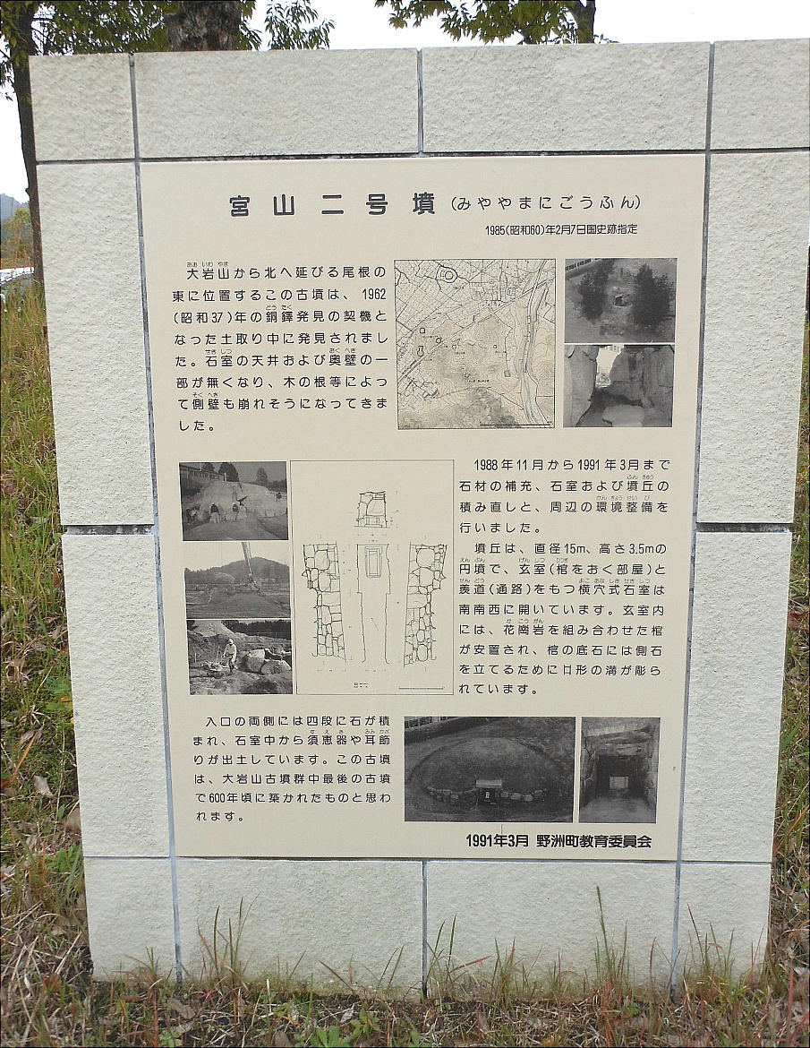 角にある、史跡宮山2号墳は国史跡大岩山古墳群8基の中でも最後の首長の墓と考えられる古墳で、大きな石を使った石室の中に石