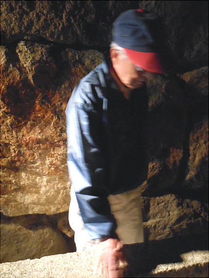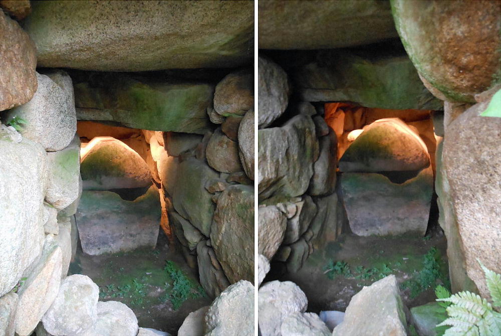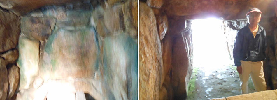 花崗岩の板石が露出していた前方部からは、西に入口をもち全長4.3m、玄室の長さ2.4m、幅1.0m以上の奥壁に向かって左