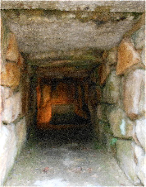 西側に入口をもつ石室は、奥に向かって天井石が1石づつ階段状に低くなり、床も斜めに下がる約6mの通路(羨道)がる。玄室は、奥