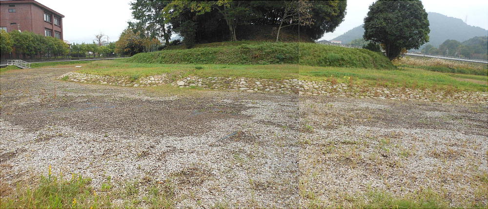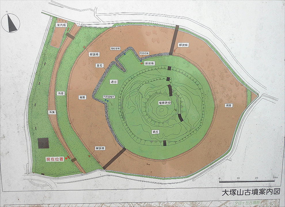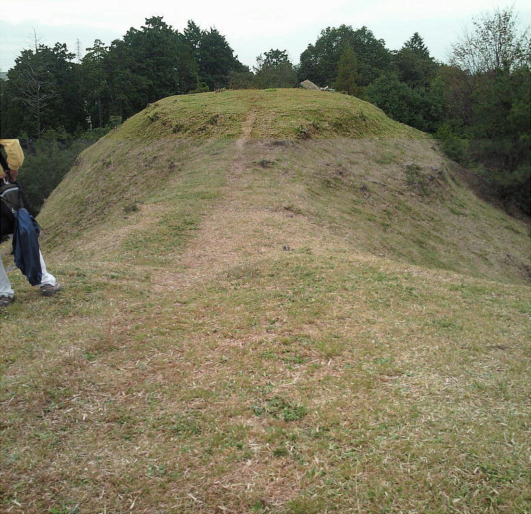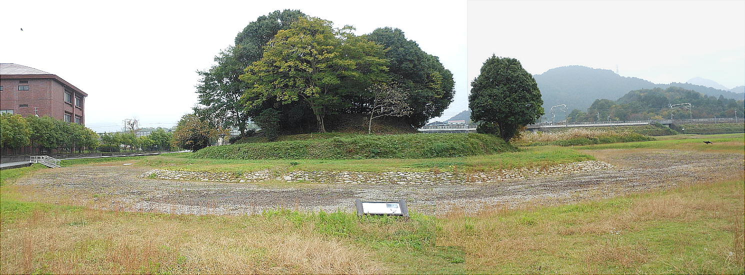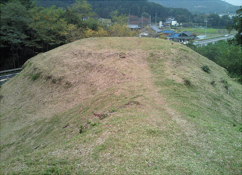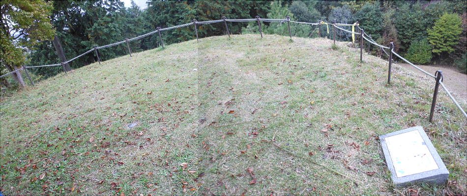 さ8.5mで、周囲へは幅13〜20mの濠が巡り、5〜10mの外堤をはさんで外側にも幅3m以上の溝が確認できた。また、葺石、