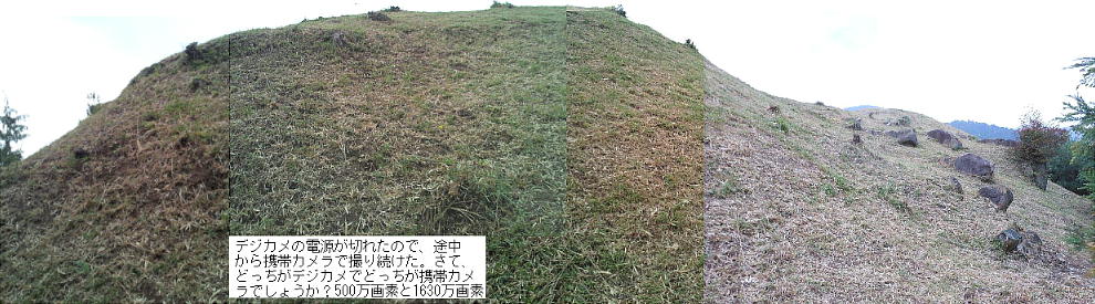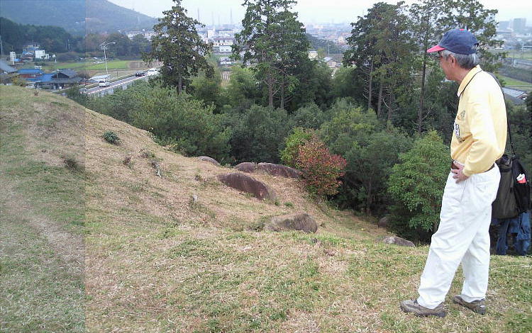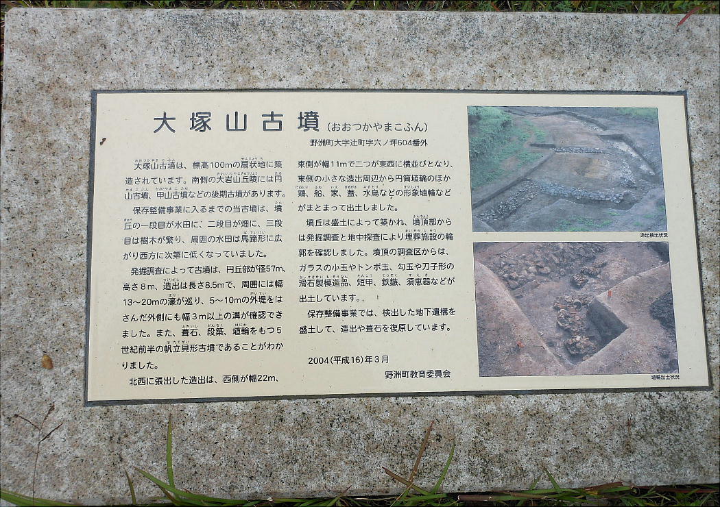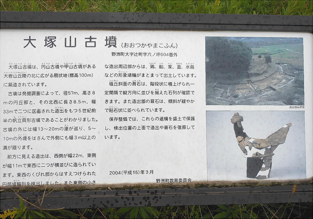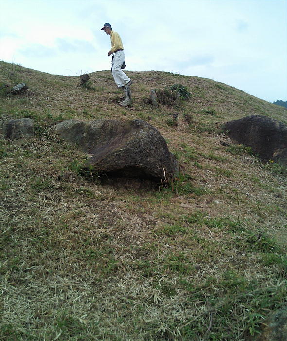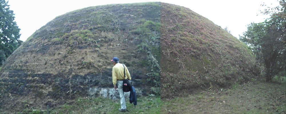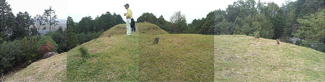 さ8.5mで、周囲へは幅13〜20mの濠が巡り、5〜10mの外堤をはさんで外側にも幅3m以上の溝が確認できた。また、葺石、