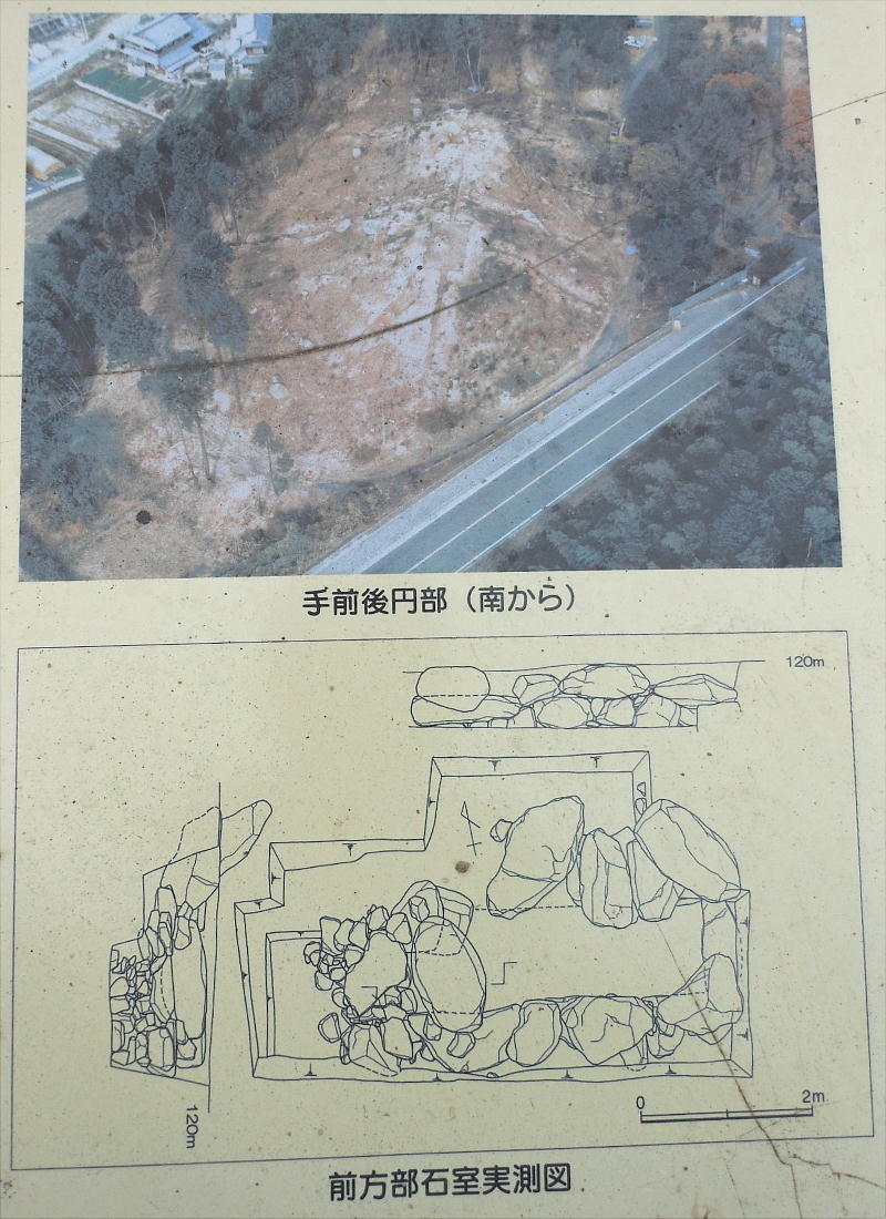部径24mを測り、前方部の頂きが標高119.9m、後円部の頂きが110.2mと、前方部が後円部より大きく、わずかに高くな