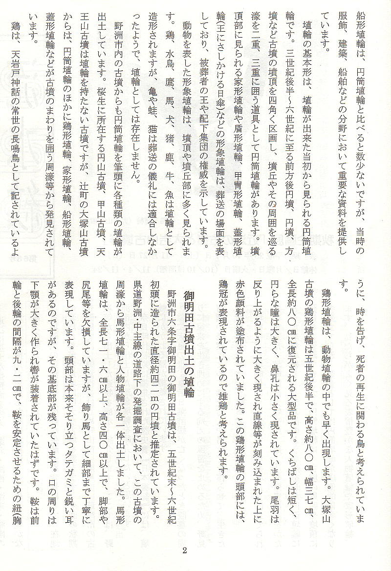 鶏、船、家、蓋、水鳥などの形象埴輪がまとまって出土した。墳丘は盛土によって築かれ、墳頂部からは埋葬施設の輪郭を確認した。