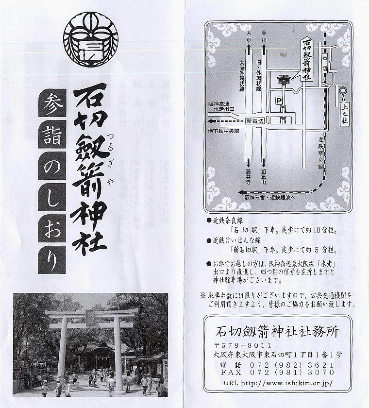 交通: 近鉄生駒線石切駅 西へ下る700M 地下鉄中央線→近鉄乗り入れ新石切駅 東北へ500M