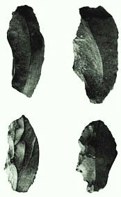 上右の写真は、石切神社付近にある神並遺跡からみつかったサヌカイト製のナイフ形石器である。左は、生駒山の中腹にある草香