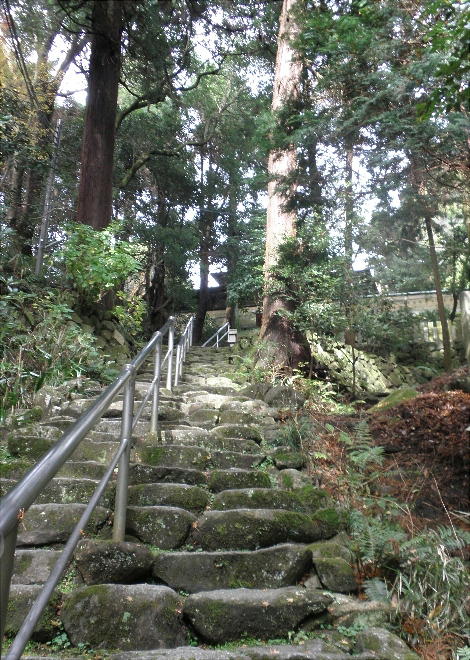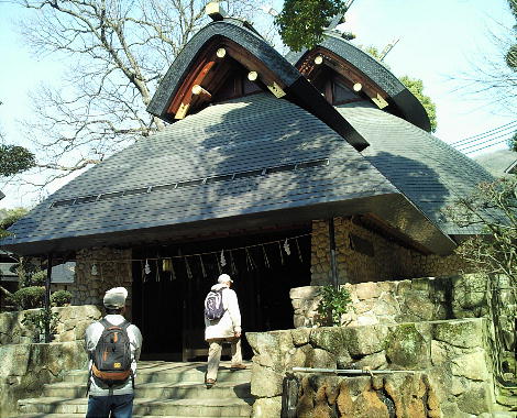 に達す。神域一千坪弱、幣殿・神輿庫・末社相并び巨樹蓊欝として社頭を蔽ふ。一石あり、伝へ云ふ神武天皇東征のとき生駒山を越