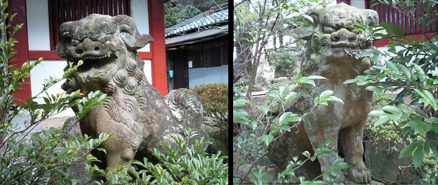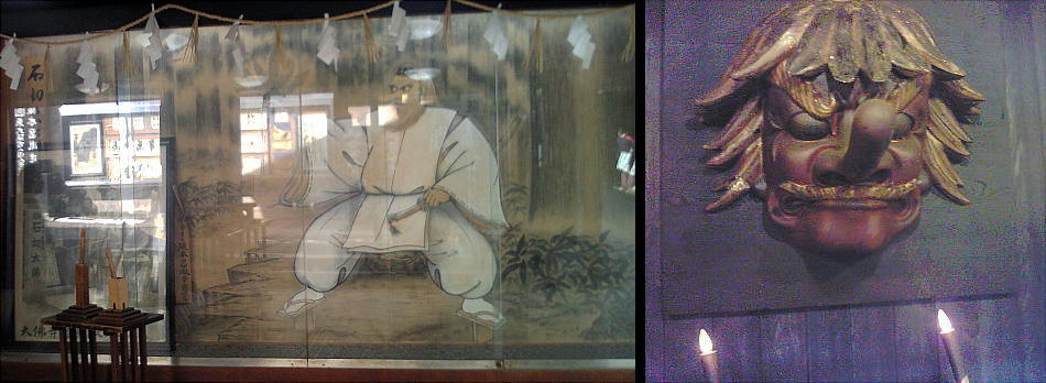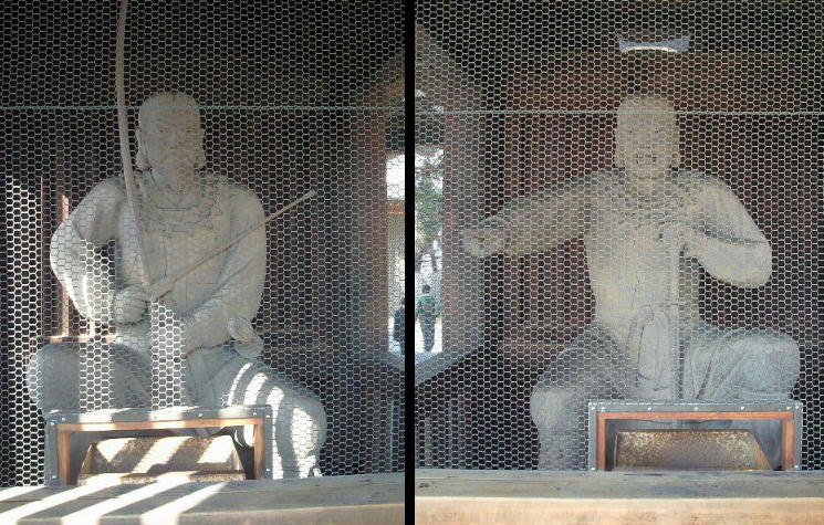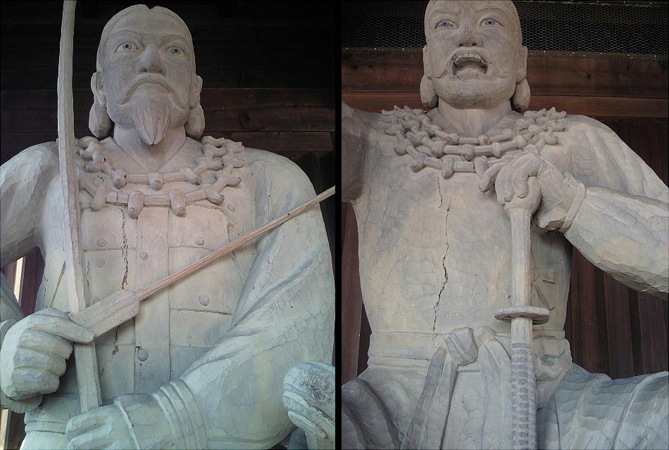 裏側から、神社の正面に当る山門の方へ出てくると、通常仁王が建っている場所には、饒速日命とともに降臨した神々の内の2神が