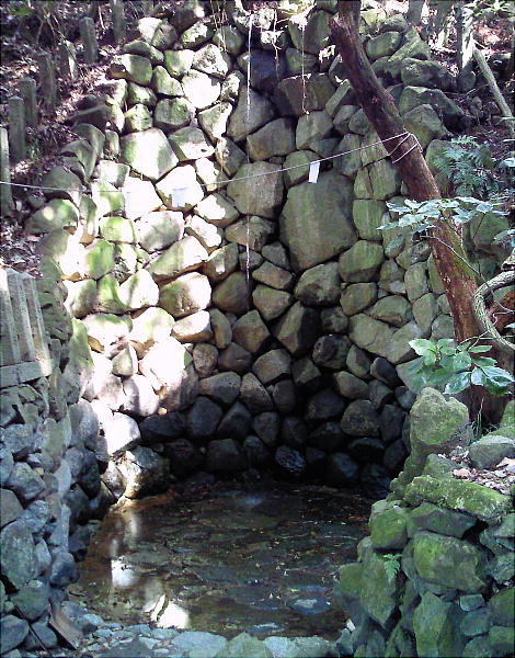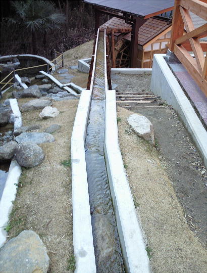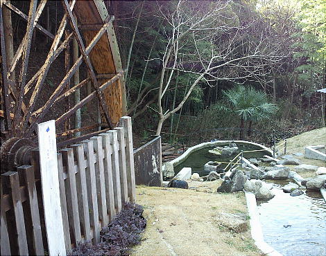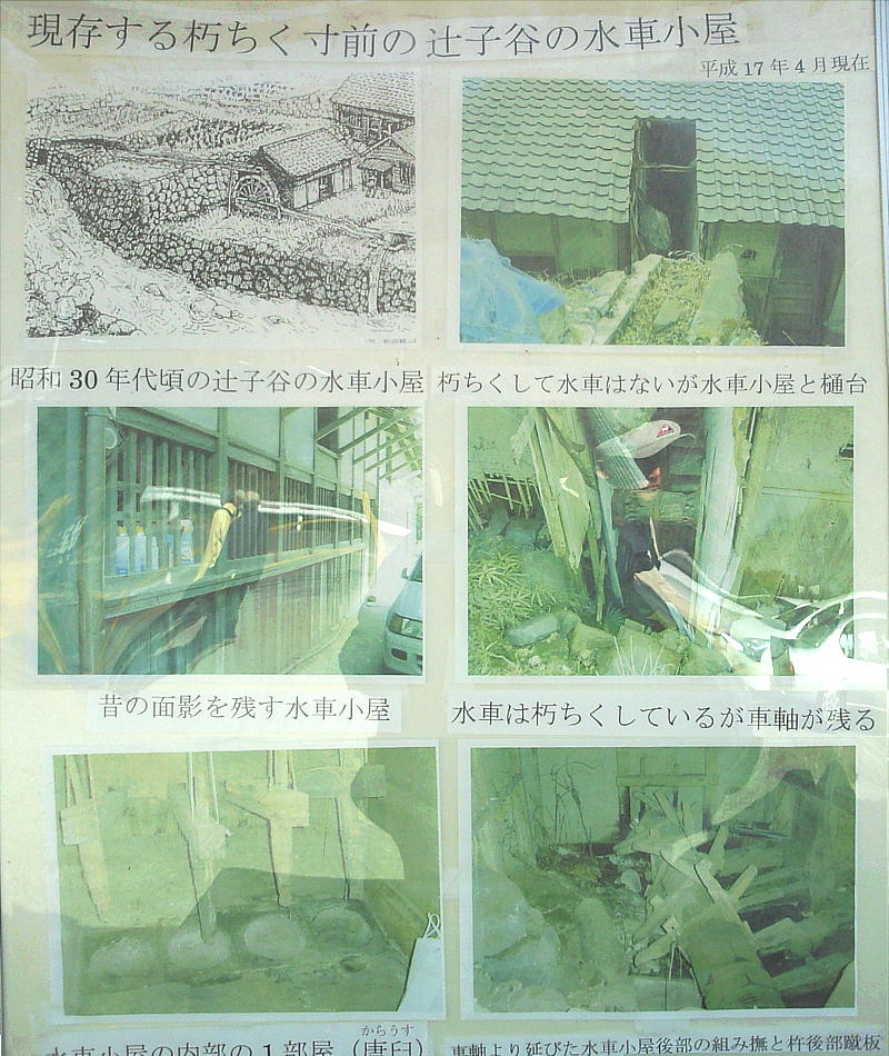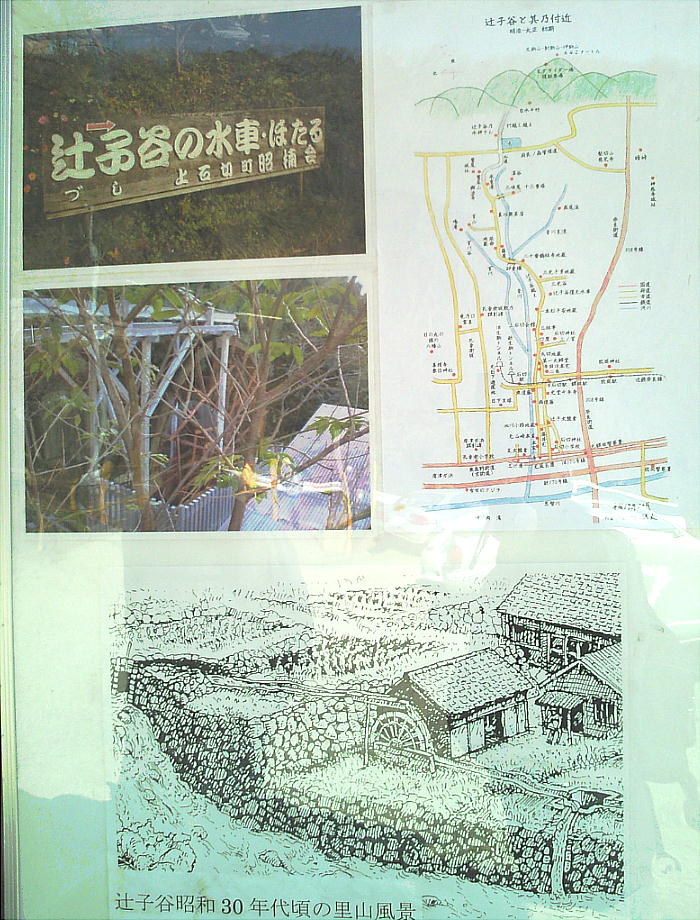 上左は、辻子谷にあったという水車を模したもの。昔ここに実物が掛かっていた。ここから下方一帯が日下の地である。