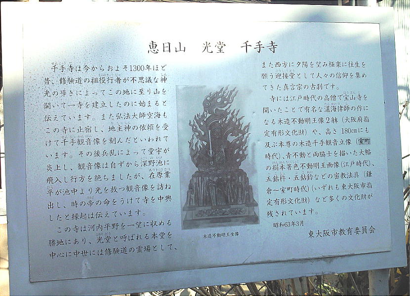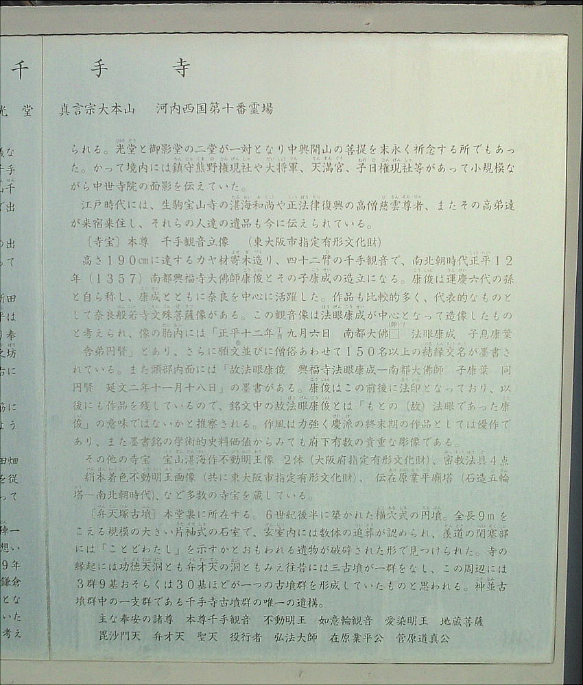 【由緒】千手寺は今から1300年程前、笠置山千手窟で修業していた役行者が不思議な神光に導かれてこの地に到り、千手観音が諸々