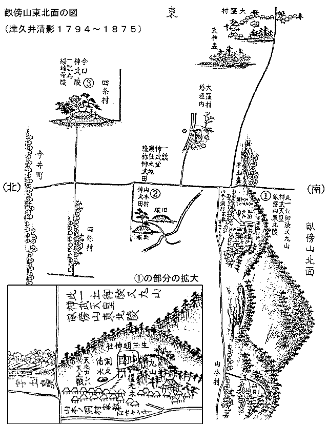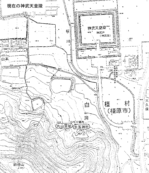 のものであり、発掘も不可能である。しかし、現在の神武天皇陵(白橿村山本のミサンザイ:神武田)は、古地図で見る限り明らか