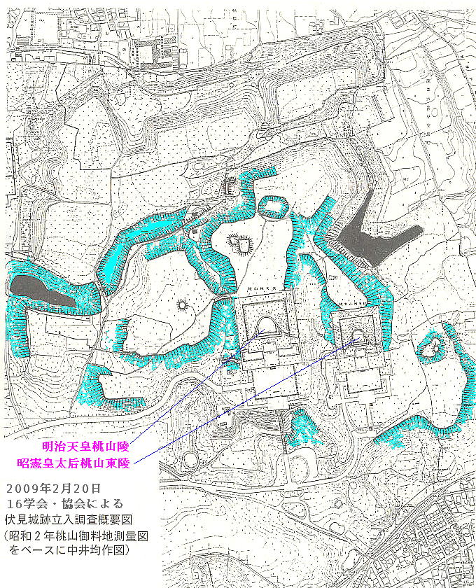 上記の図は、2009年2月20日に行われた、宮内庁書陵部が管轄する「伏見御陵」域内への「立ち入り調査」の範囲を図
