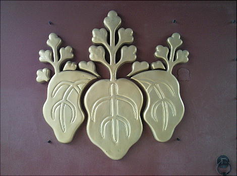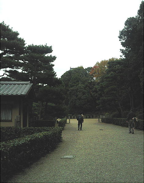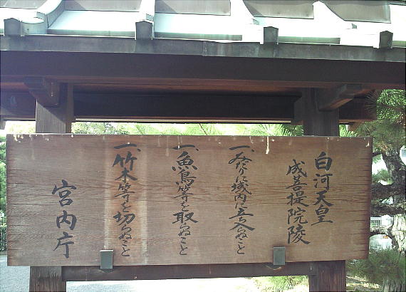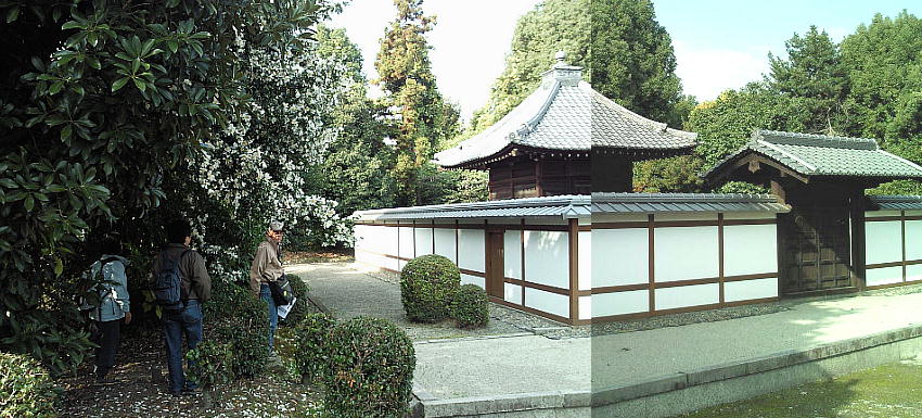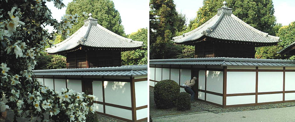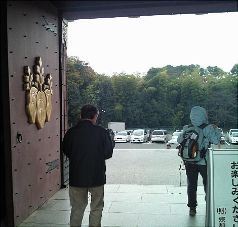 不埒者が御門の中を覗き込んでいる。傍には椿(?)の花が咲き誇っている。泉涌寺等は別にして、確かに建物を持った天皇陵とい