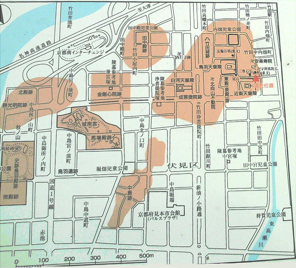 ていた)。現在の近鉄竹田駅、名神高速道路京都南インターチェンジ付近が離宮の跡地で、東西約1.2〜1.5km、南北約1kmの範囲に