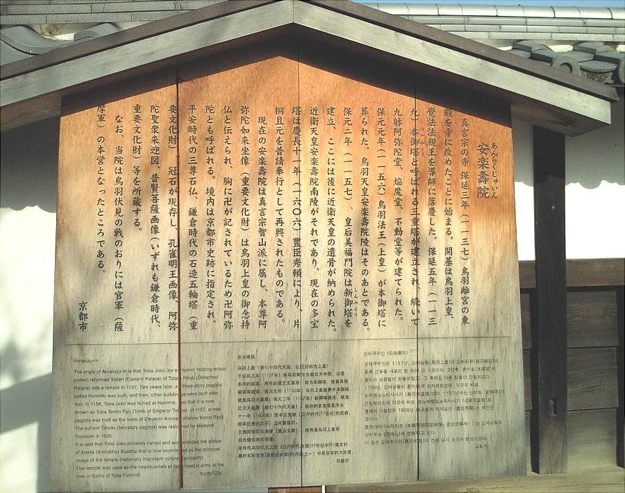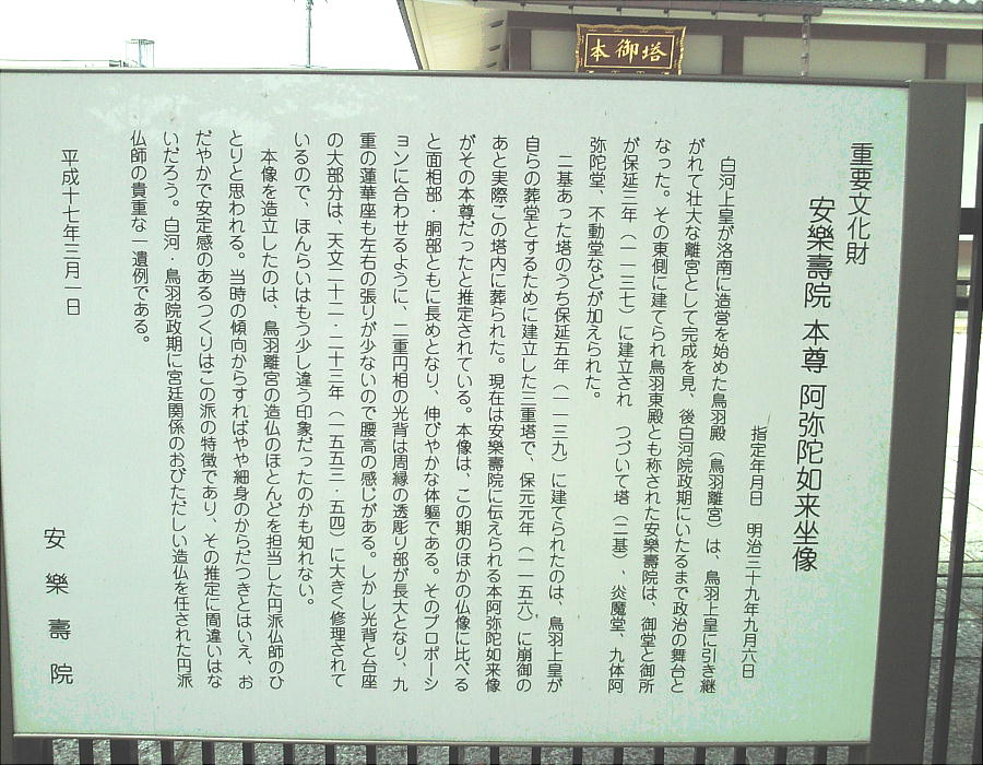 前述のように、安楽寿院は鳥羽離宮東殿に鳥羽上皇が営んだ仏堂(本尊は阿弥陀三尊)が起源で、創建は保延3年(1137年)のこと