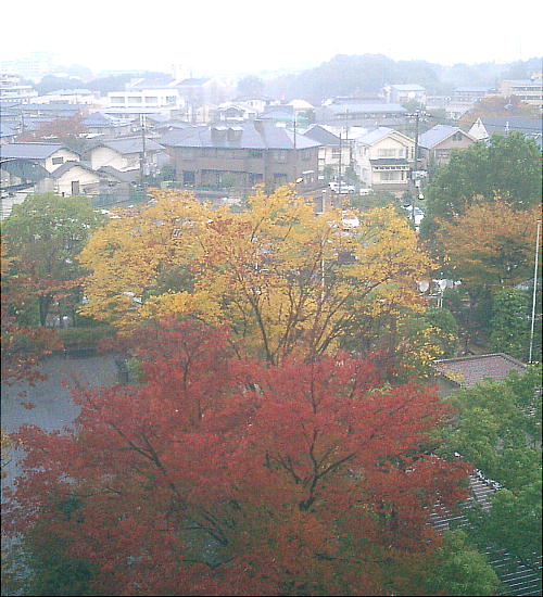 下界では紅葉真っ盛りの11月下旬。私の部屋から見たマンションの広場の紅葉。今日は