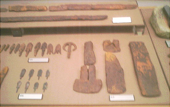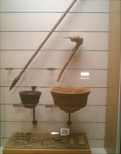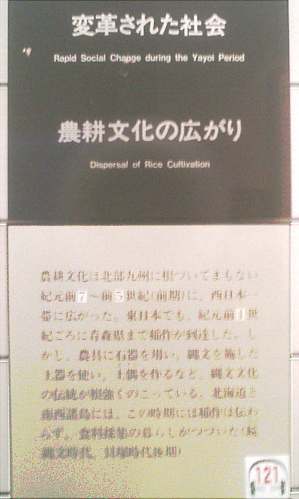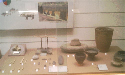 上左は高床倉庫(1世紀)の復元。どこの遺跡のものかは見落としたが、稲の穂を摘んで収穫し、