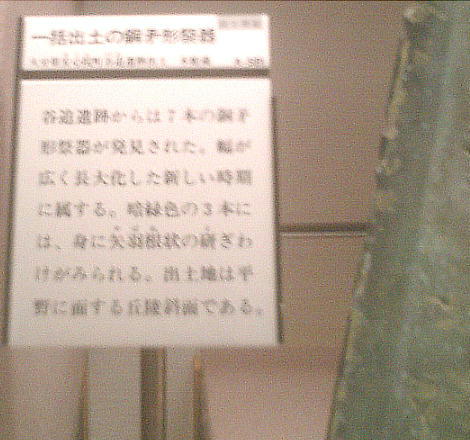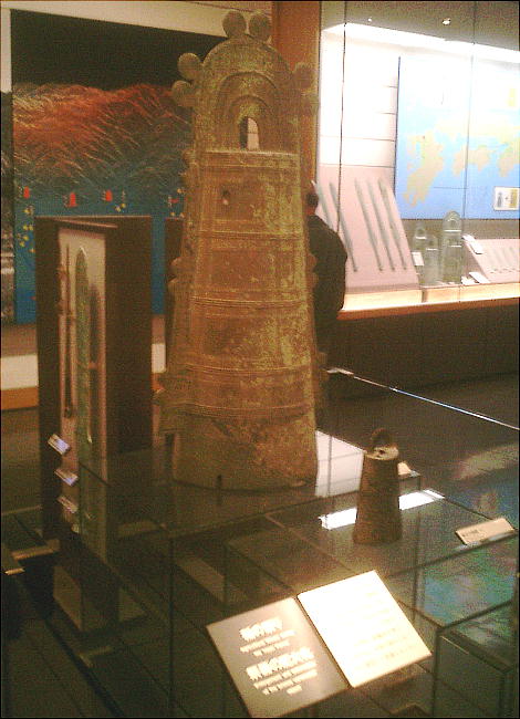 銅鐸。弥生時代の儀式に関連する青銅器。筒状で裾の広がった身と鈕(ちゅう)からなる。