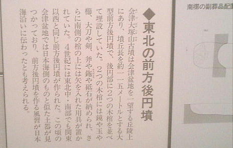 会津大塚山古墳からの出土物。東北へ拡大した前方後円墳の中でも大規模なもの。「遺跡巡り」に訪問レポートがある。