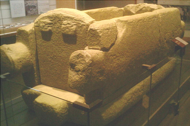 長持型石棺(5世紀)。群馬県お富士山古墳の数個の石材を組み合わせた長持型石棺。