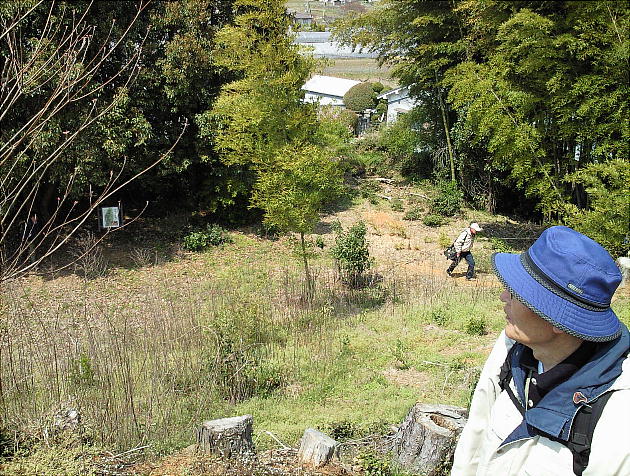 いつも後円部からばかり見ているので、今回は前方部の端から濠を見る。ここから古墳の縁を歩けそうだったので入ってみた。