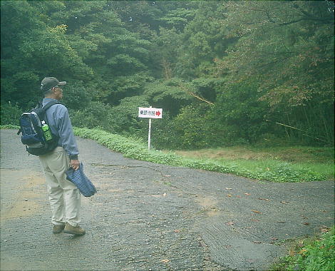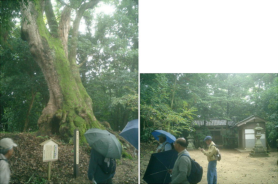 村のはずれの天神様で小休止。靖さんが堆肥を造るのに、落ち葉の下からなにやら雑菌を集めていた。
