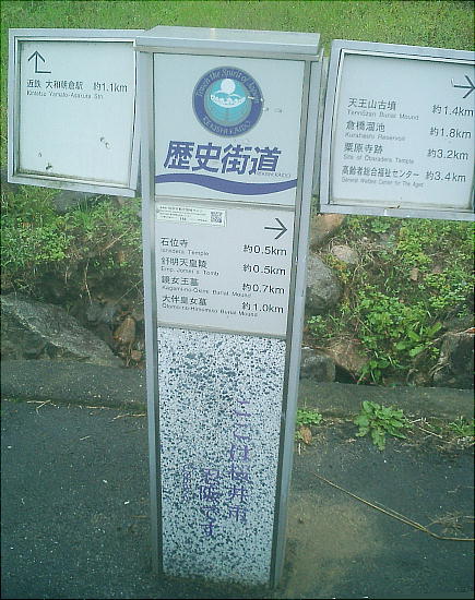 「忍阪」バス停の傍に、石位寺方面の標識が立っている。標識に従って集落に入って行くと、集落を横切る旧街道ぶつかる。石位寺へ行