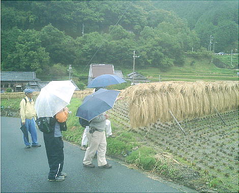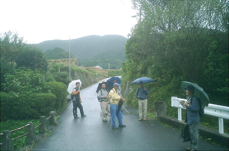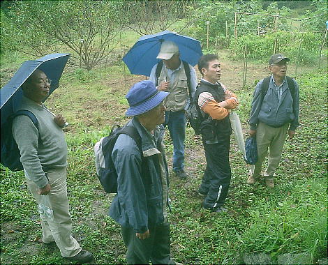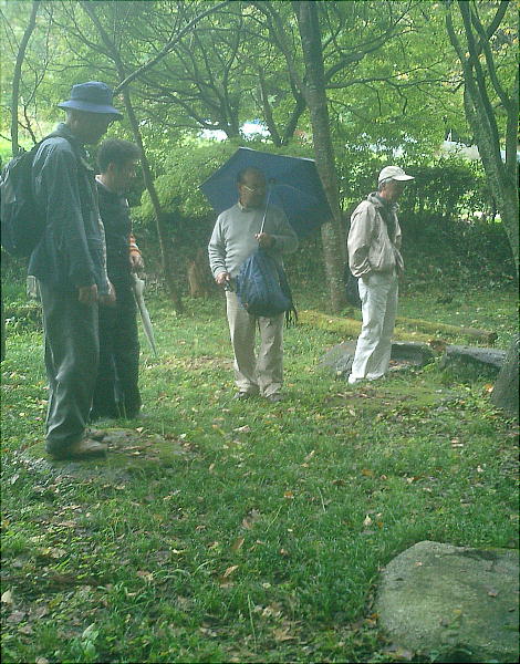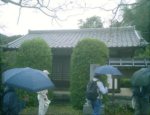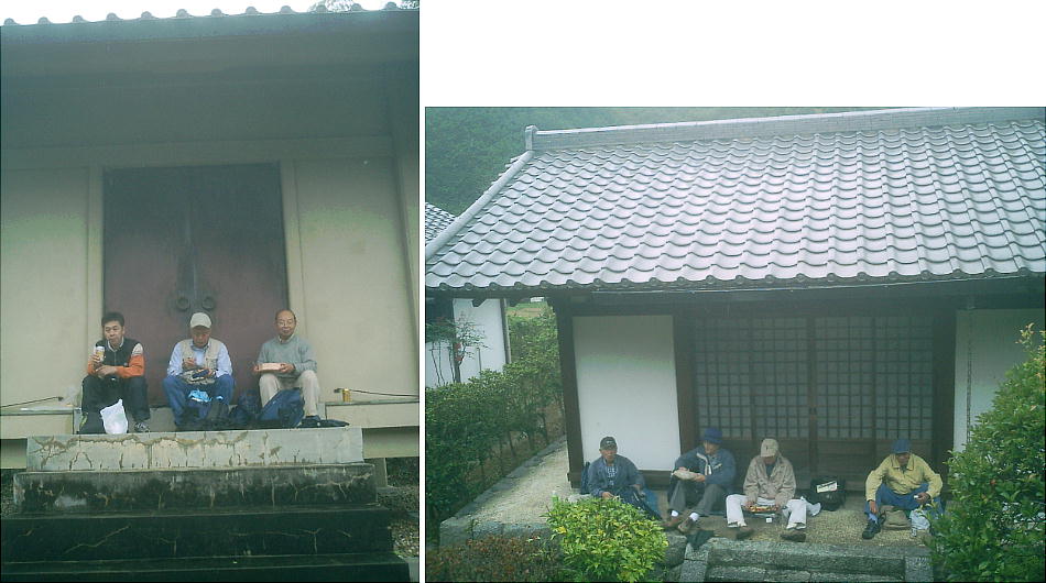 お堂と収蔵庫に分かれて雨の中の昼食。雨の中の昼食はこれで4,5回目かな。我々の例会はほとんど晴れるのだが、今日は誰か良くな