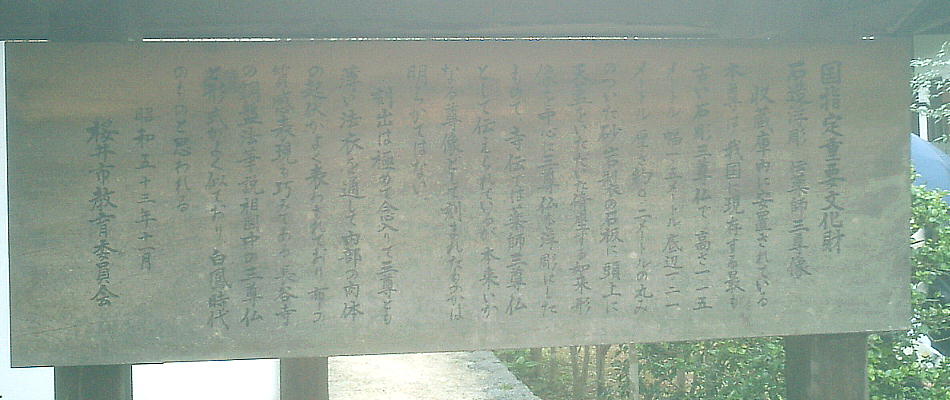 収蔵庫に安置されている本尊は、白鳳時代に製作された薬師三尊であると伝えられている。我が国に現存する最も古い石彫りの三尊仏で、