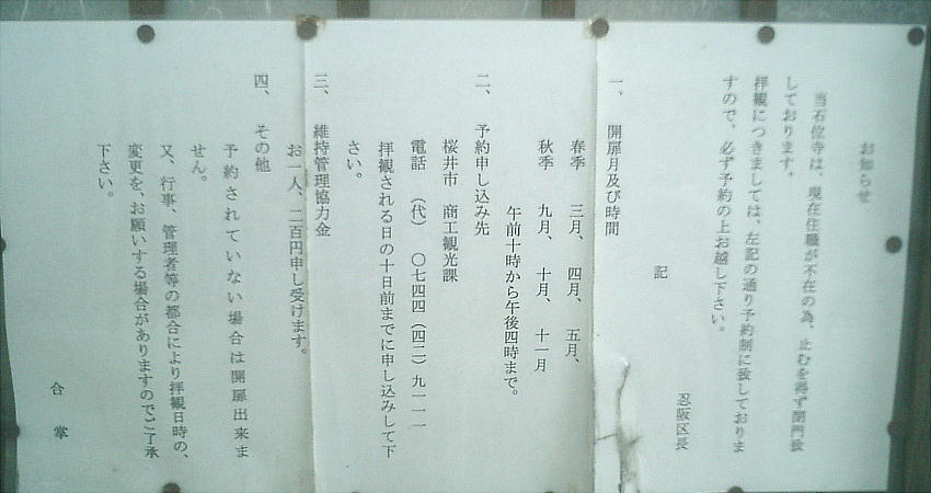 できる時期は3月から5月および9月から11月と限定されており、桜井市観光課にあらかじめ電話予約が必要である。