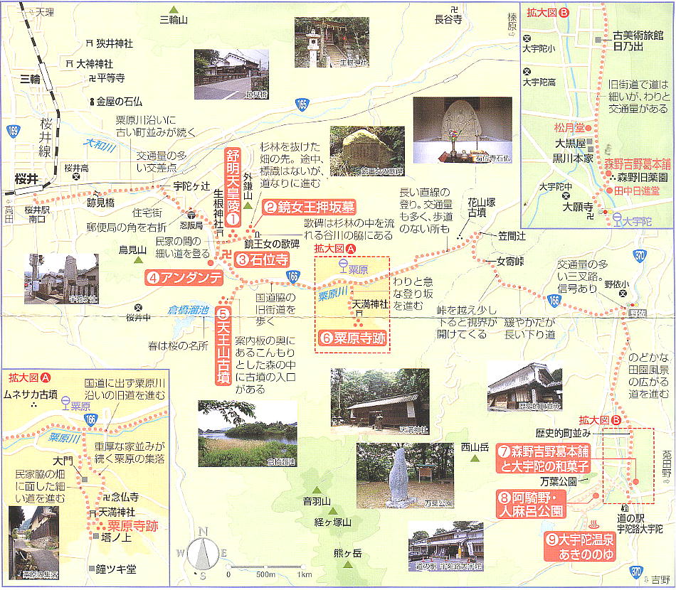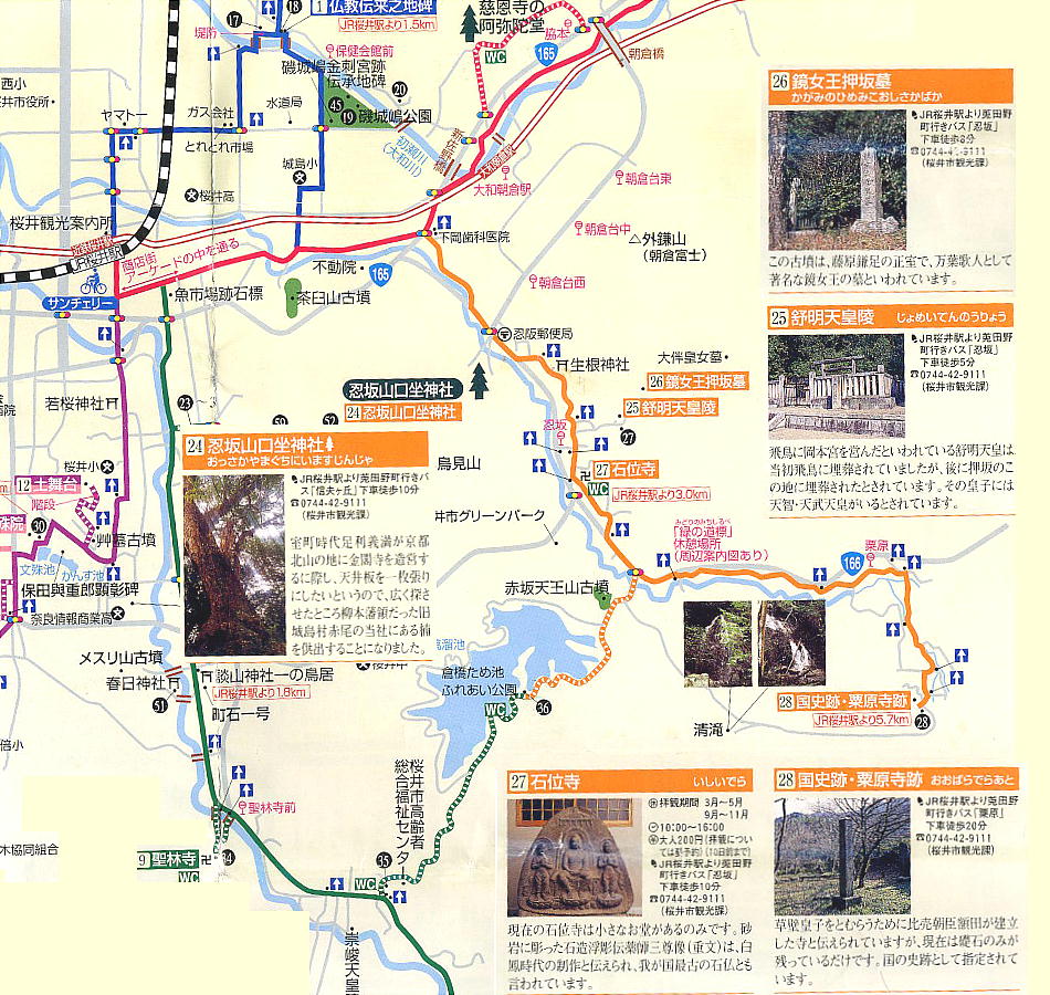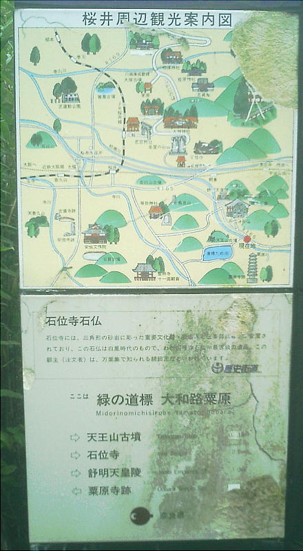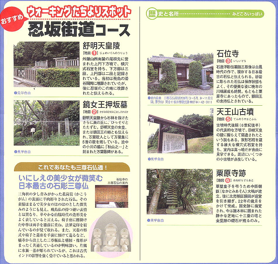 れる粟原・忍阪から磯城島を結ぶ道が粟原道である。わが国で最古の石仏といわれる白鳳時代の三尊石仏がある石位寺。額田王が老後の