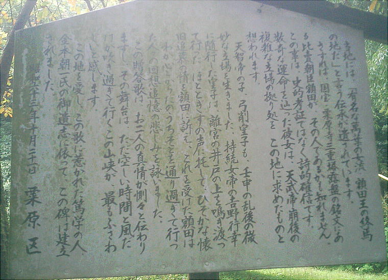 上の粟原集落に建立された寺だが、比売朝臣額田が額田王であるとする言い伝えが古くからある。 以前は寺の庭に放置してあったのを、