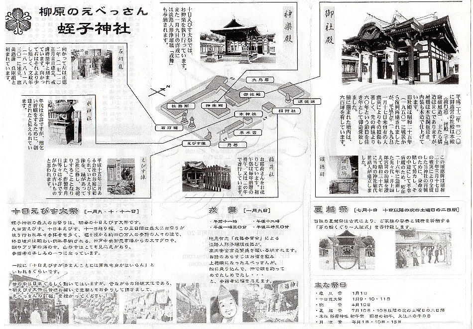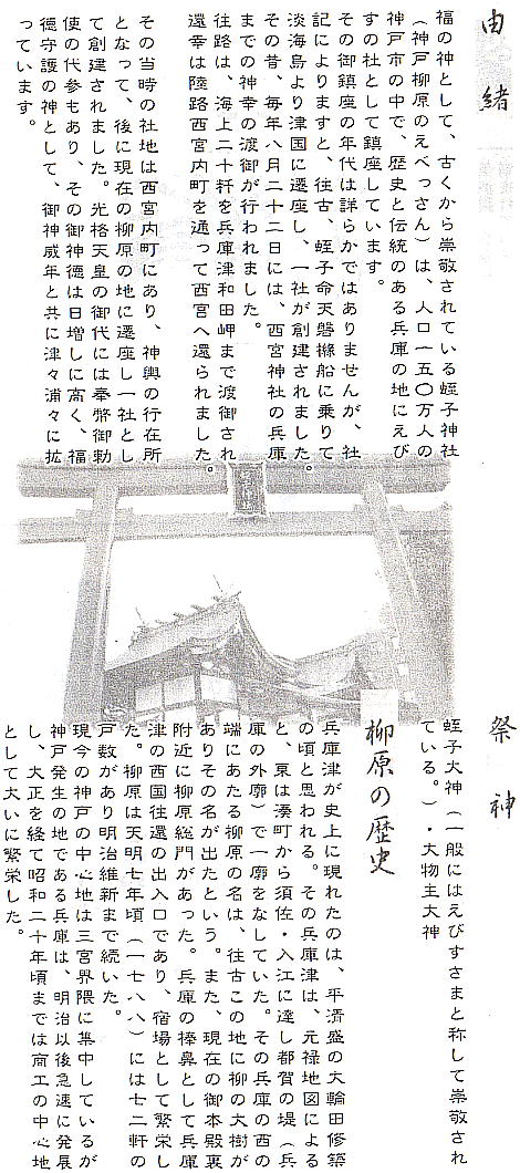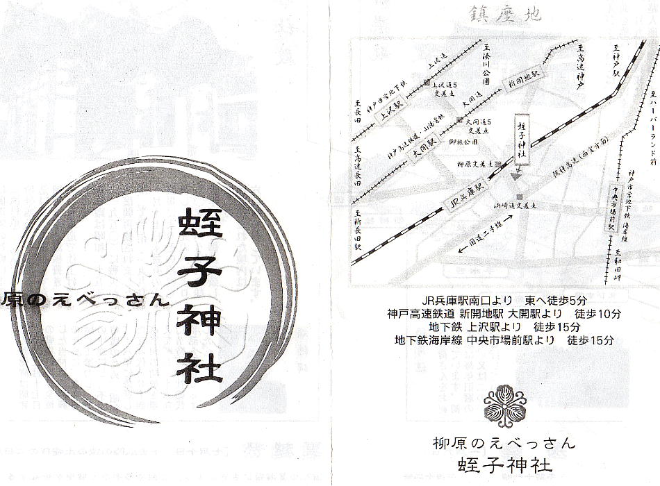 創建年代は不詳だが、元禄五(1692)年の兵庫津の「寺社改帳」に出てくる。現在は「柳原のえべっさん」という愛称で親しまれ、毎年、