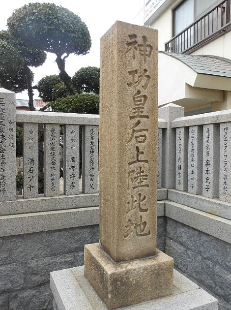 和田神社のとなりにある。神功皇后が応神天皇を抱えて、武内宿禰とともに近畿へ凱旋した場所がここだという伝承に基づく。