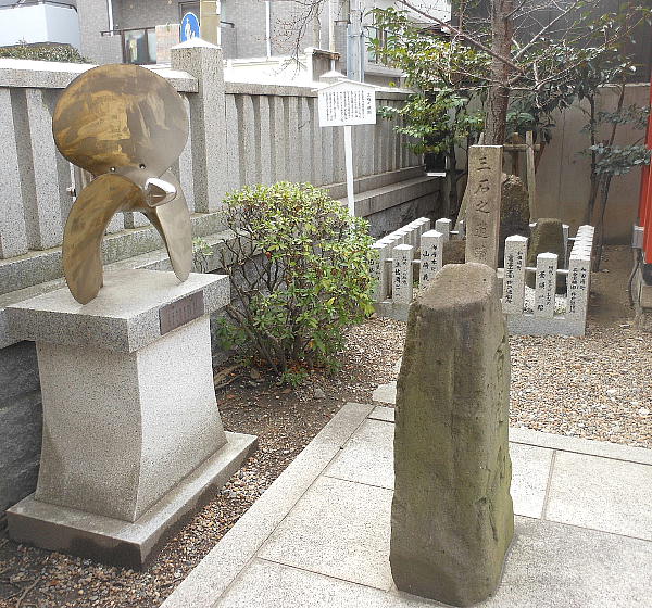 お百度石の後ろには、造船の町らしくスクリューのモニュメントまである。