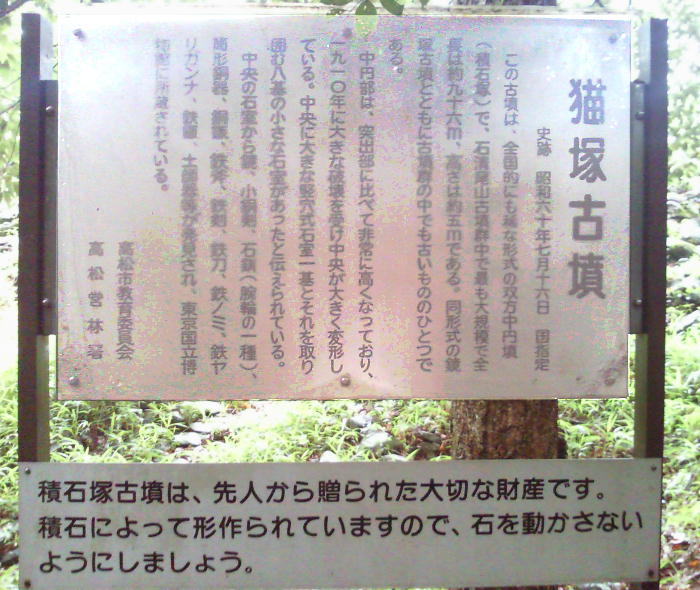 猫塚古墳は、全国でも非常に珍しい双方中円墳の積石塚で、全長約96m、高さは約5mを測る。この古墳は、明治43年(1910)