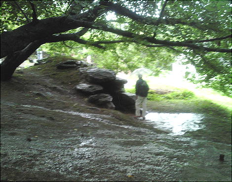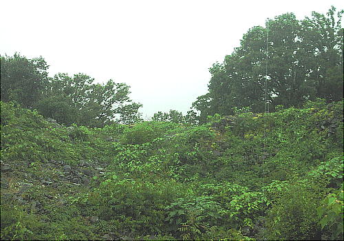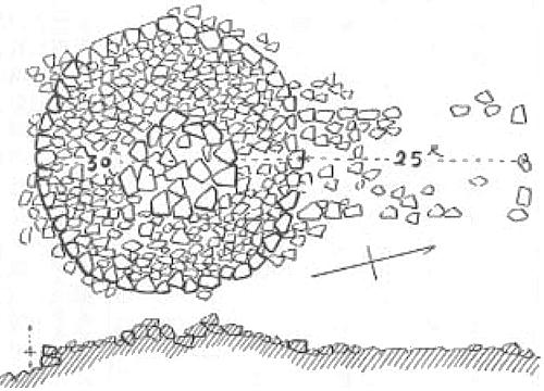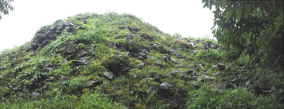 下の測量概略図を見ると前方後円墳であるのがよくわかるが、上の写真を見てもそうとはわからない。が、確かに積石塚の古墳であ