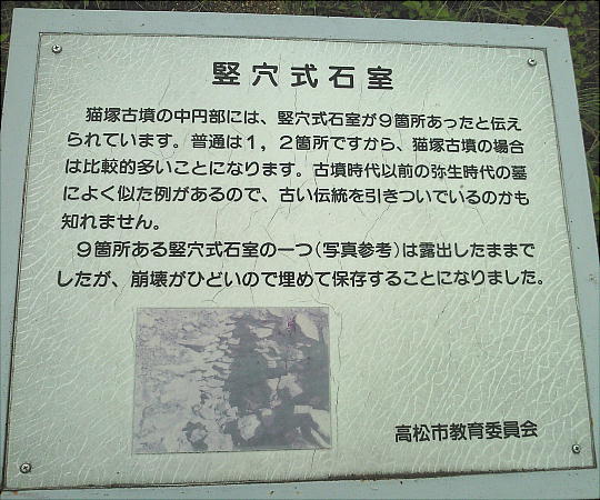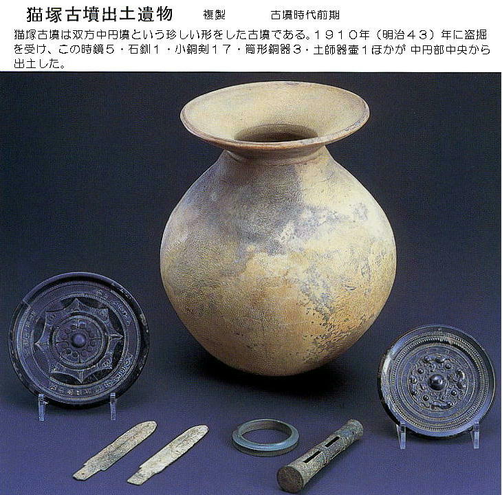 刳抜式石棺が納められている。猫塚は、この古墳群中最大で、全長95b、高さ5bで出土品も豊富である。出土品の一部は、高松