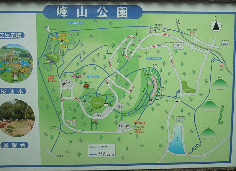 峰山公園の周りを巡る道路沿いにある。芝生の広場を左へ曲がりしばらくいくと、右側に10mほど入った民家の庭先に横穴式石室