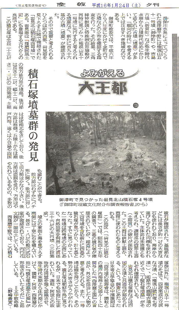 〜7世紀頃の積石塚古墳が、極めて多く存在する。想像をたくましくすると、讃岐から東へ渡った連中が、既に近畿にいた別の渡来
