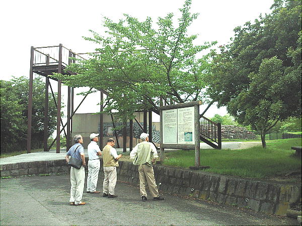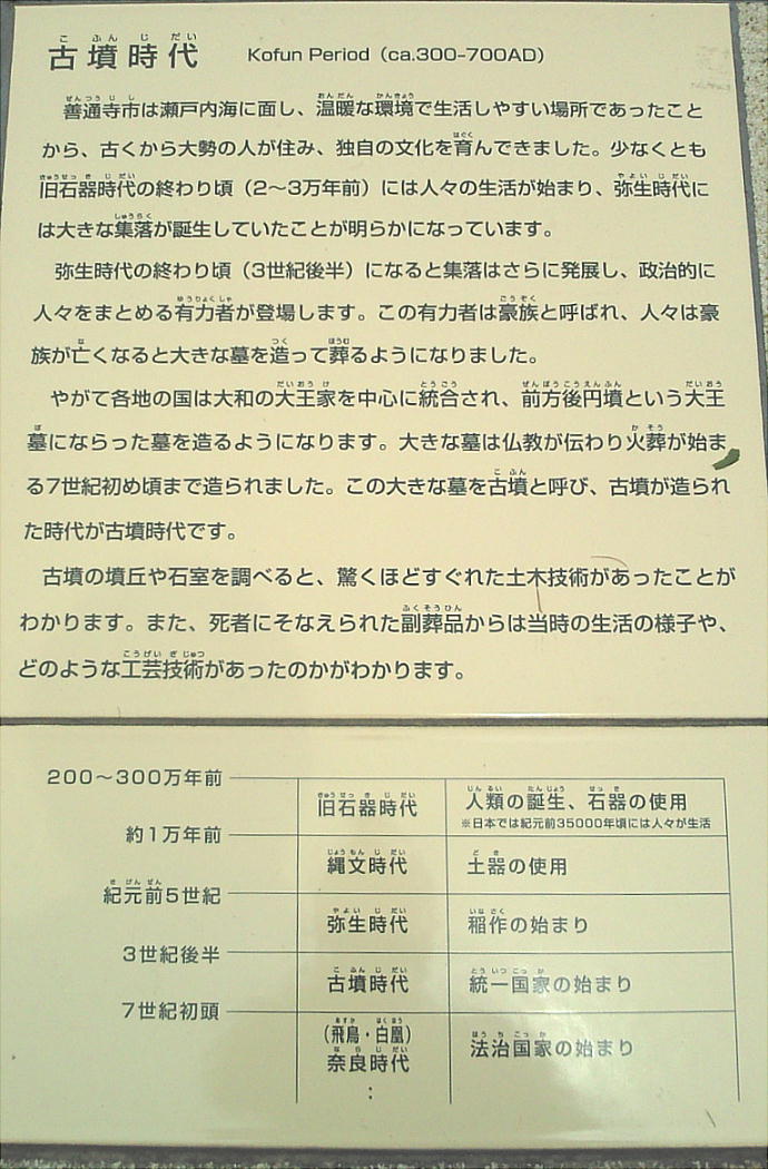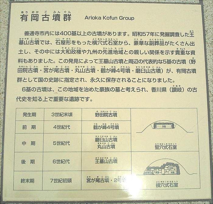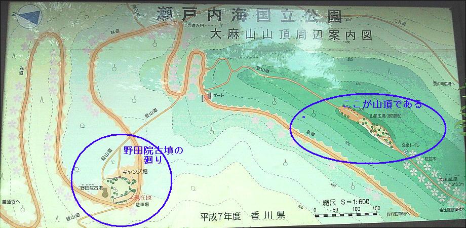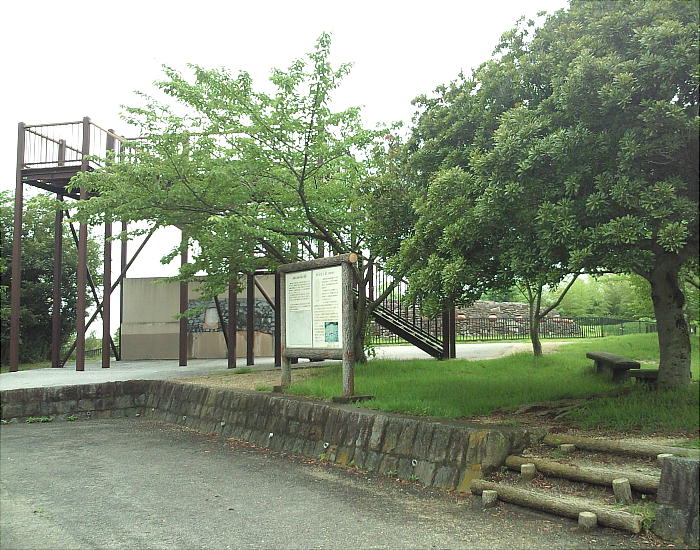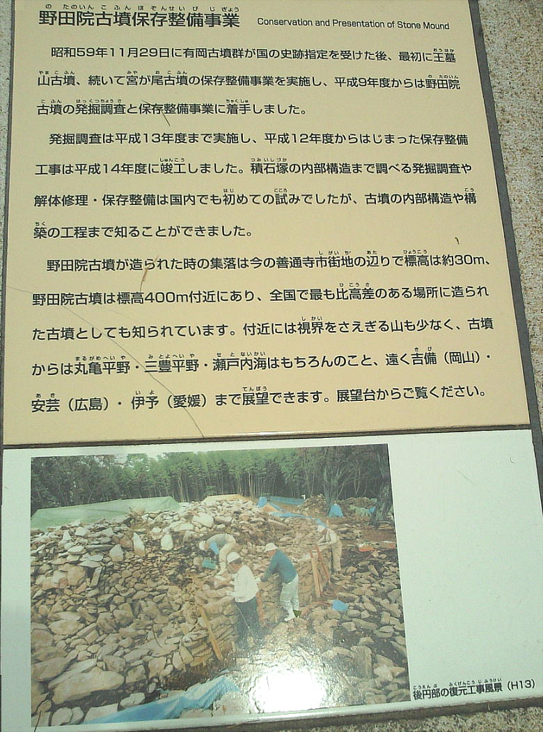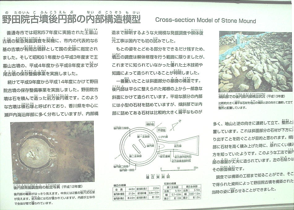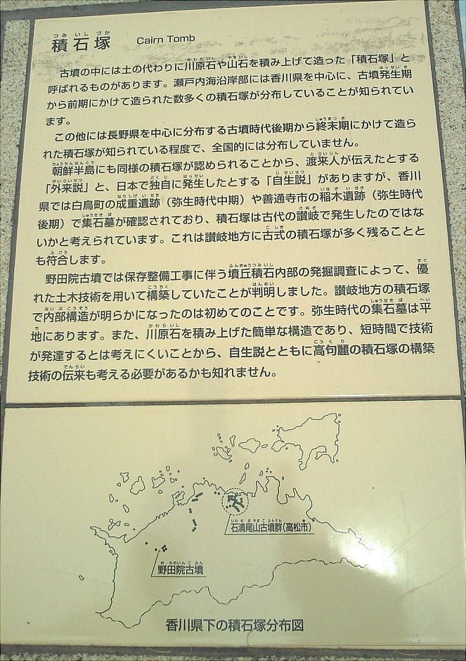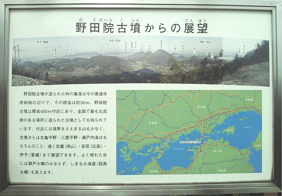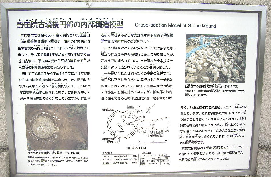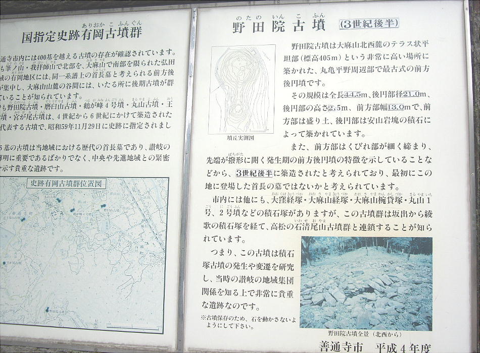 展望台の下に、野田院古墳の説明板がある。丸亀平野で最古式、前方後円墳の祖型、後円部全体が積み石塚、高松の「岩清尾山古