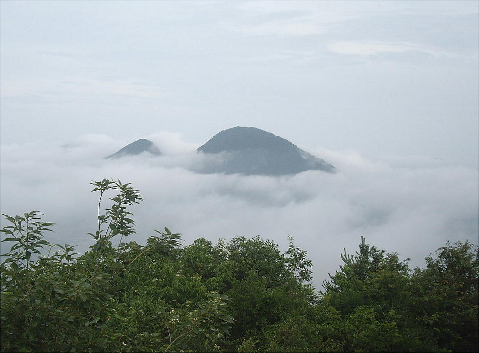 雲海の中に「我拝師山(がはいしざん)」、中山(なかやま)が浮かんでいる。善通寺五岳の2つで、五岳山縦走というのは、香